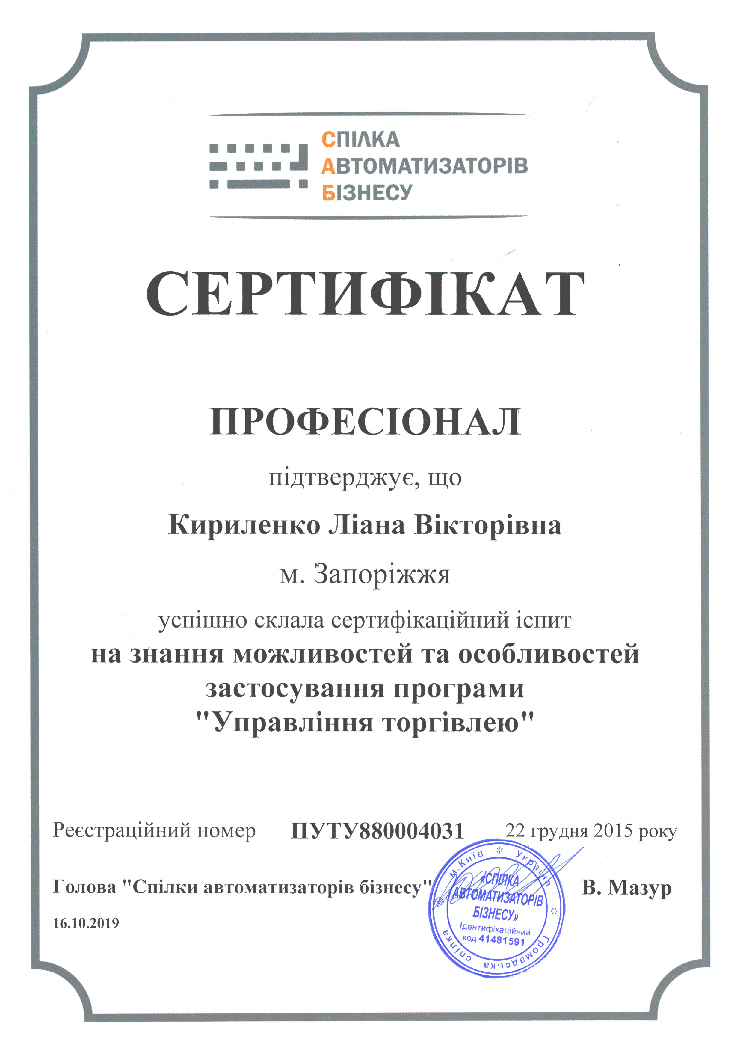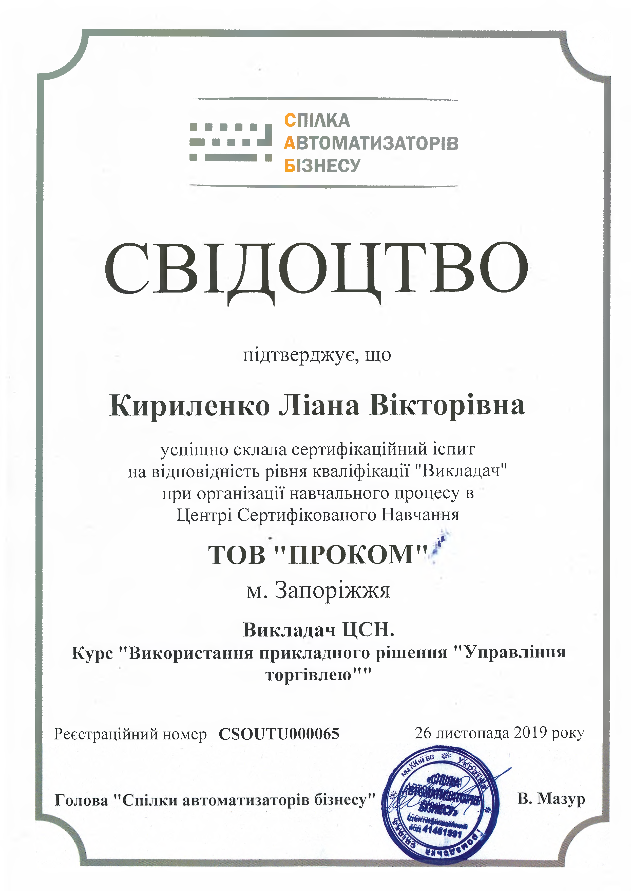 - Викладач ЦСН курсу «Використання прикладного рішення BAS Управління торгівлею»