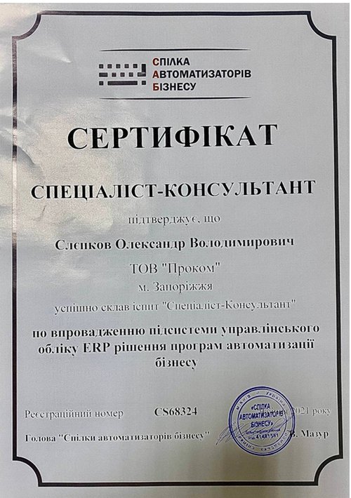 Співробітник ТОВ «Проком» з 2015 року. Консультант з впровадження інформаційних систем, методист.