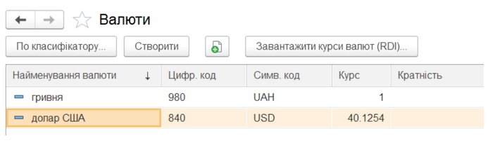 У довіднику Валюти повинна бути заповнена інформація про всі використовувані на підприємстві валюти і завантажені поточні курси валют. Використання мультивалютного обліку на підприємстві визначається встановленою функціональною опцією Кілька валют в розділі НДІ і адміністрування - Настройка НДІ і розділів - Підприємство.