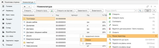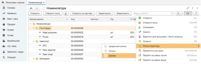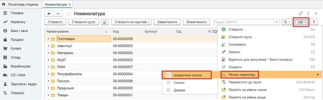 Для кожного ієрархічного довідника існують три режими перегляду: «Ієрархічний список» (показує ієрархічну структуру довідника верхнього рівня або вкладені елементи чи підгрупи обраної групи рис. 1.1), «Список» (показує групи та елементи без урахування ієрархії, рис. 1.2) та «Дерево» (показує повністю ієрархічну структуру довідника, одночасно групи та елементи всіх рівнів, рис. 1.3).