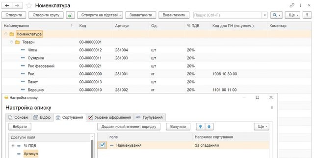 Рис 1.4 – Налаштування сортування списку елементів довідника «Номенклатура» за спаданням першого поля «Найменування»
