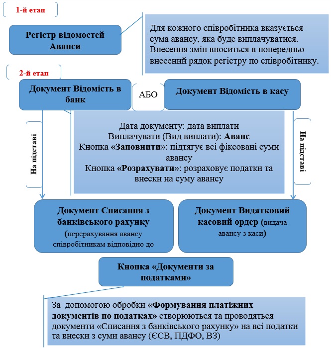 Схема документообігу нарахування та виплати авансу в прикладному рішенні BAS Бухгалтерія