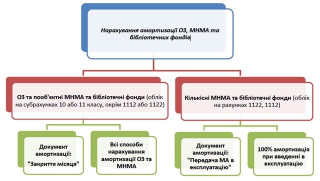 Інформацію по нарахуванню амортизації ОЗ, МНМА та бібліотечних фондів в конфігурації «BAS Бухгалтерія» наочно представлено Схемою 1.