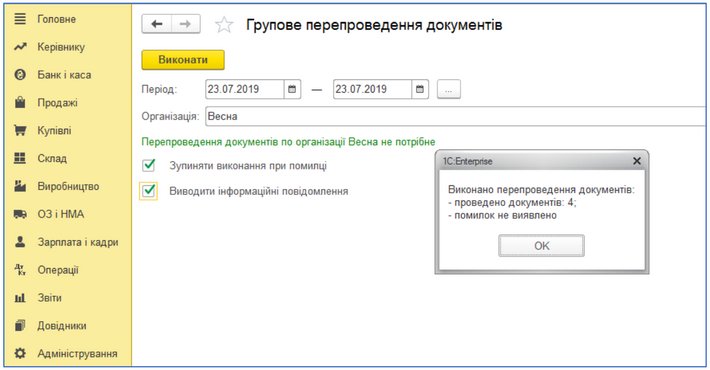 Після запуску групового перепроведення програма запропонує: