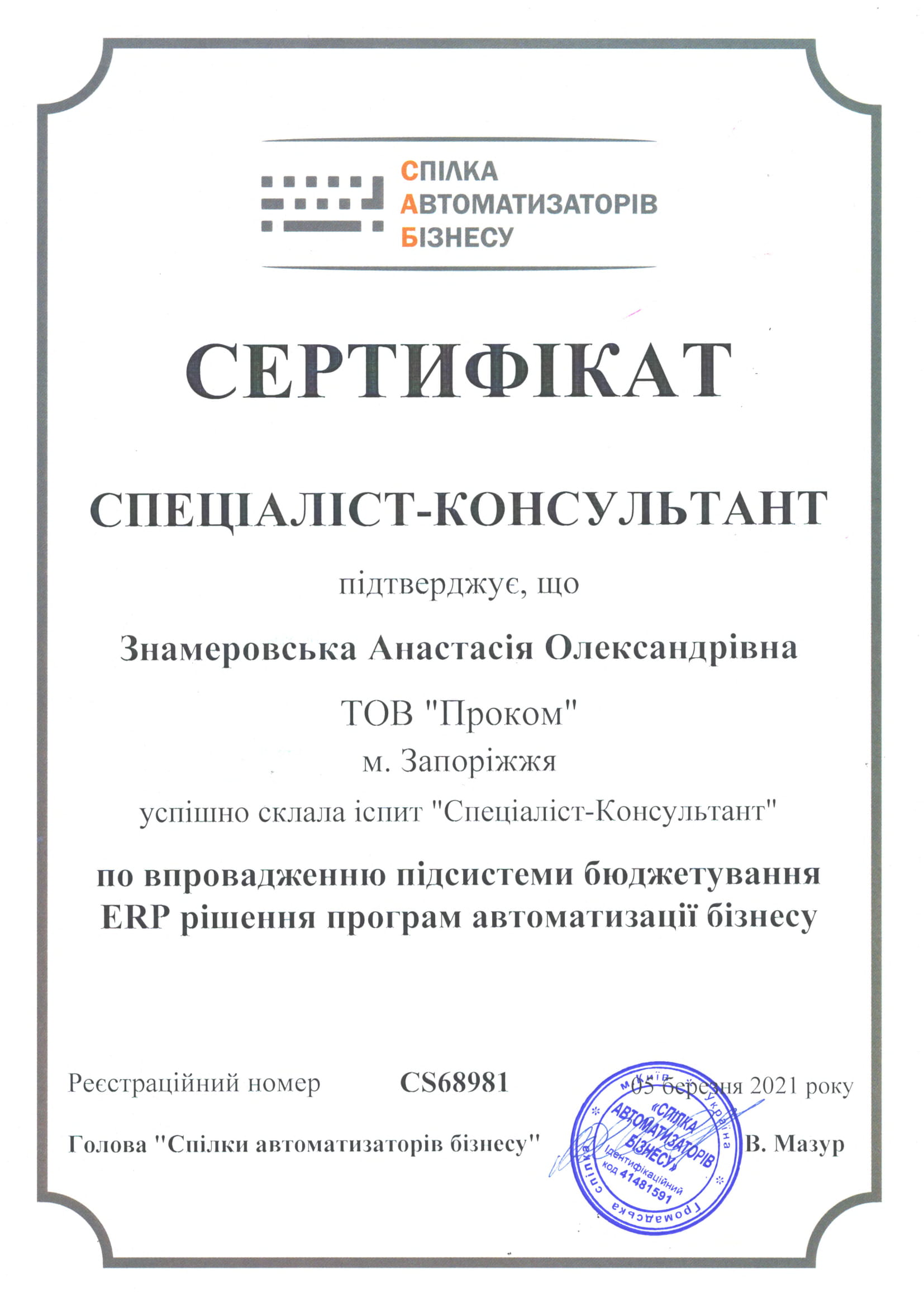- Специалист-консультант по внедрению подсистемы Бюджетирования ERP решения программ автоматизации бизнеса
