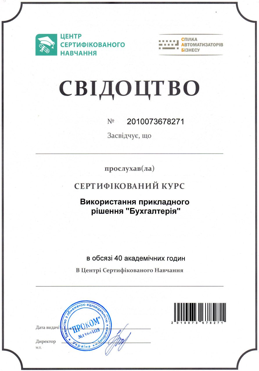 официальное свидетельство САБ (Спілка автоматизаторів бізнесу) |